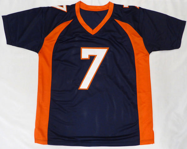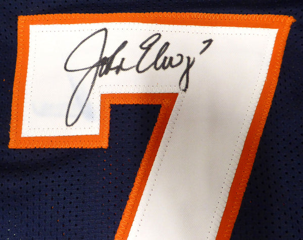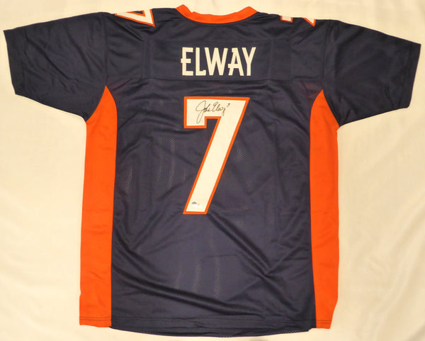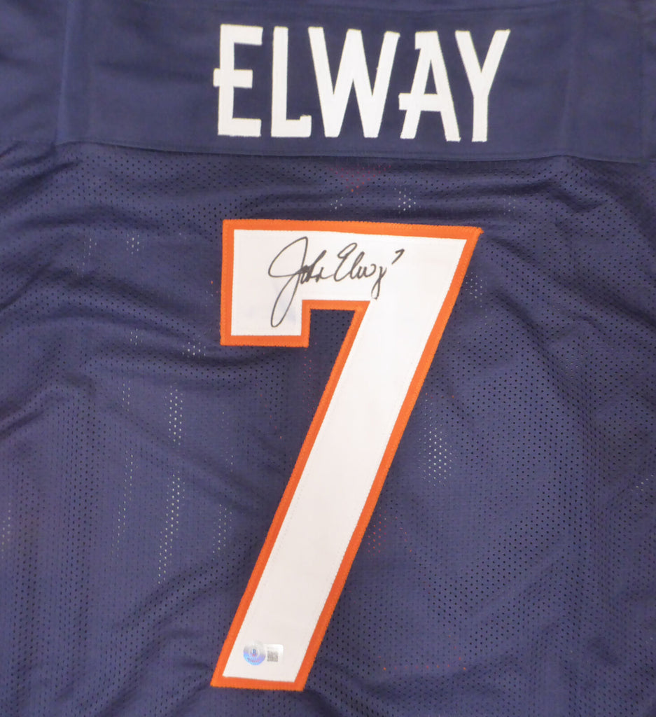 This is a Blue Jersey that has been hand signed by John Elway. This is a custom jersey with no name brand. The approximate size is XL. It has nice sewn in name and numbers. This item has been certified authentic by Beckett Authentication (BAS) and comes with their tamper-proof QR Code sticker that can be verified on the Beckett-authentication.com.