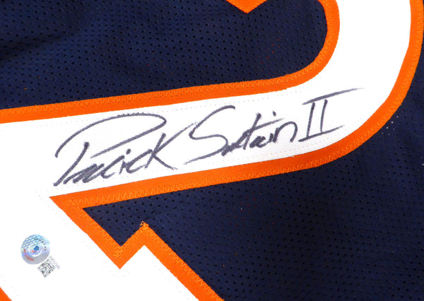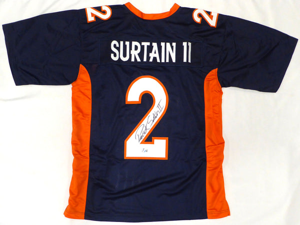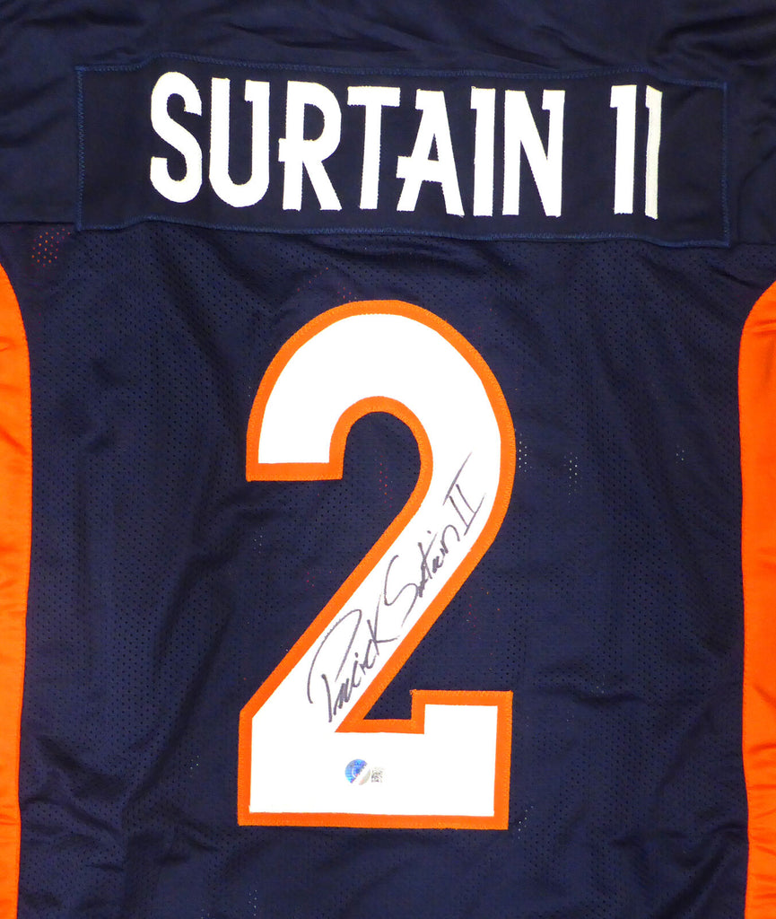 This is a Blue Jersey that has been hand signed by Patrick Surtain. This is a custom jersey with no name brand. The approximate size is XL. It has nice sewn in name and numbers. There are marks on the item as shown. This item has been certified authentic by Beckett Authentication (BAS) and comes with their tamper-proof QR Code sticker that can be verified on the Beckett-authentication.com.