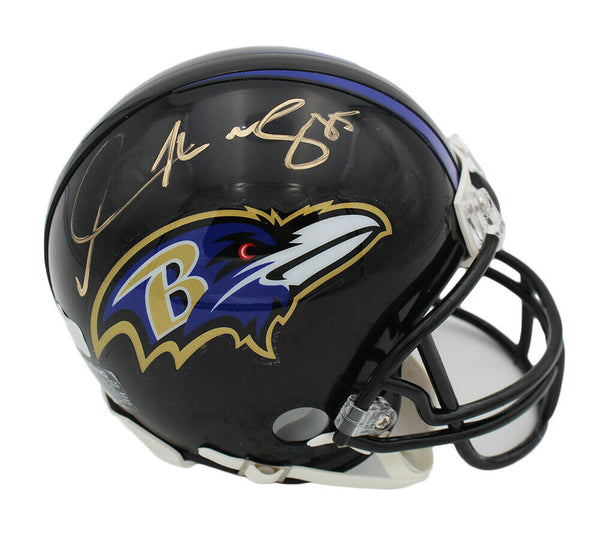 An Baltimore Ravens Current NFL Mini Helmet Hand Signed by Derrick Mason. The item and signature are in excellent condition. Derrick was drafted in 1997 in Round:4 and was in Pick:98. Derrick is a 2xPro Bowl(2000,2003). Derrick plays as a Wide Receiver for his position. Derrick First-Team ALL-Pro (2000). Derrick was a Receiving Yards would be 12,061. AUTHENTICATION: The item is accompanied by a Certificate of Authenticity - Serial Numbered and Databased Hologram - Picture of Derrick from the Signing