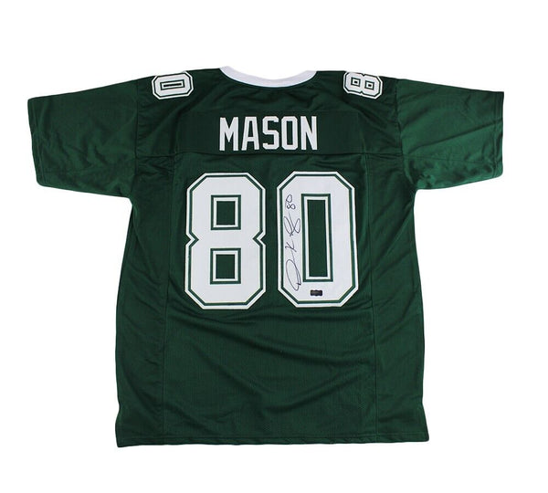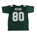 A Michigan State Custom Green Jersey Hand Signed by Derrick Mason. The item and signature are in excellent condition. Derrick was drafted in 1997 after playing for Michigan State. He is a a Wide Receiver, 2x Pro Bowl(2000,2003) selection, and First-Team ALL-Pro (2000). AUTHENTICATION: The item is accompanied by a Certificate of Authenticity - Serial Numbered and Databased Hologram - Picture of Derrick from the Signing