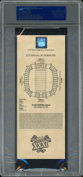 This is a Super Bowl XXXI 31 Ticket, approximately 2.75x6.5, that has been hand signed by Desmond Howard. The condition of this item was graded a Near Mint/Mint 8 by PSA. This item was inscribed "SB XXXI MVP." It has been certified authentic by PSA/DNA and comes encapsulated in their tamper-proof holder.