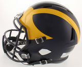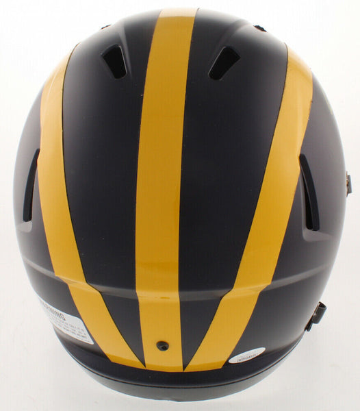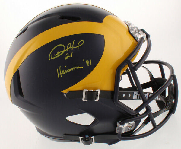 A Michigan Wolverines Full Size Replica NCAA Speed Helmet hand signed by Desmond Howard. The item and signature are in excellent condition. In addition to signing his name, Desmond inscribed "Heisman 91" on the item. Desmond won the Heisman Trophy in 1991 and was inducted into the College Football Hall of Fame in 2011. AUTHENTICATION: The item is accompanied by a JSA Certificate of Authenticity - Serial Numbered and Databased Hologram