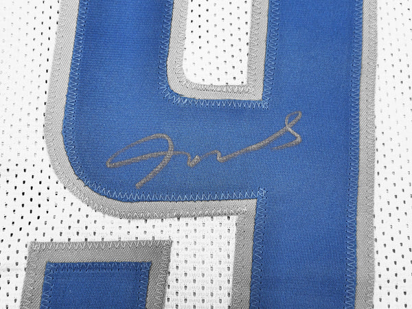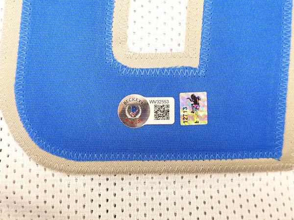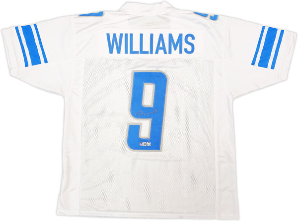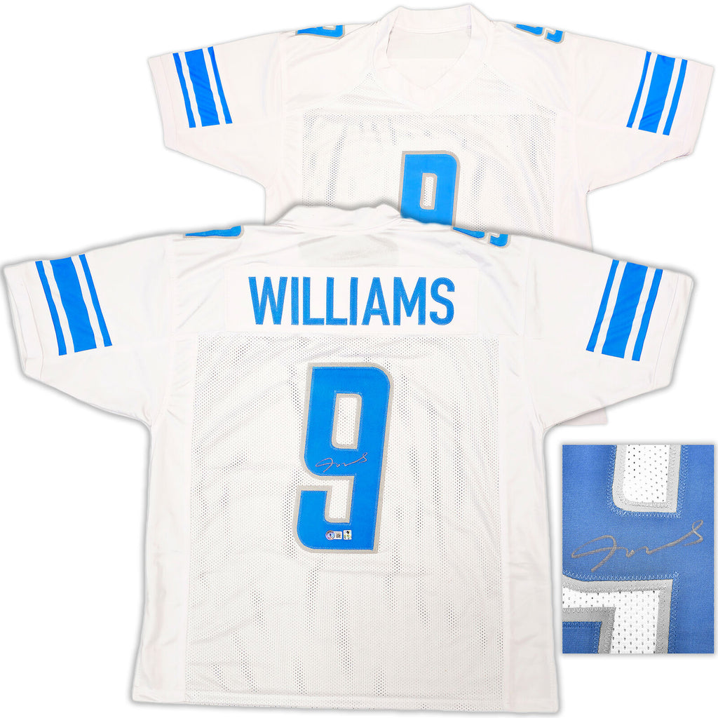 This is a White Jersey that has been hand signed by Jameson Williams. This is a custom jersey with no name brand. The approximate size is XL. It has nice sewn in name and numbers. This item has been witnessed and certified authentic by Beckett Authentication (BAS) and comes with their tamper-proof witness sticker.
