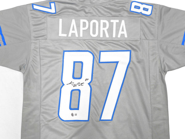 This is a Gray Jersey that has been hand signed by Sam LaPorta. This is a custom jersey with no name brand. The approximate size is XL. It has nice sewn in name and numbers. This item has been witnessed and certified authentic by Beckett Authentication (BAS) and comes with their tamper-proof witness sticker.