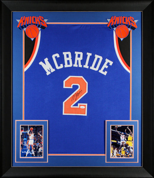 This Autographed Blue Pro Style Framed Jersey has been Personally Signed by Deuce McBride of the New York Knicks. This item is 100% Authentic to include a Certificate of Authenticity (COA) / hologram by JSA Witness. This is a JSA Witnessed Protection Program item which means a JSA representative was present when this item was being signed. We have multiples of this same item. While the photographs are representative of this item, the size, placement and strength of the signature may vary. Each item is hand signed, therefore, each autograph is unique. This item has been professionally framed to overall dimensions of approximately 32 x 37 inches. This is a X-Large sized, non-branded, custom-stitched Framed Jersey. This jersey will be framed to order, it will take 3-4 days from purchase date for it to ship.