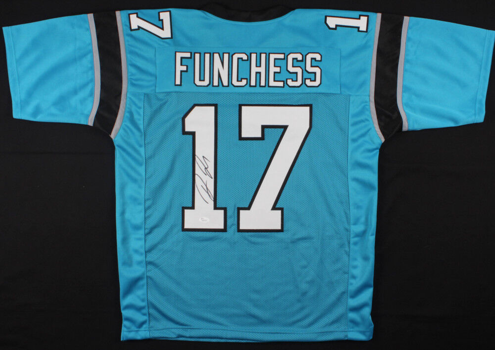 Custom on-field style jersey. Everything is sewn on, size XL. Hand-signed in black felt-tip pen by Devin Funchess. The lot / autograph(s) includes an official James Spence Authentication (JSA) hologram and matching COA for authenticity purposes.Authentication: JSA COA