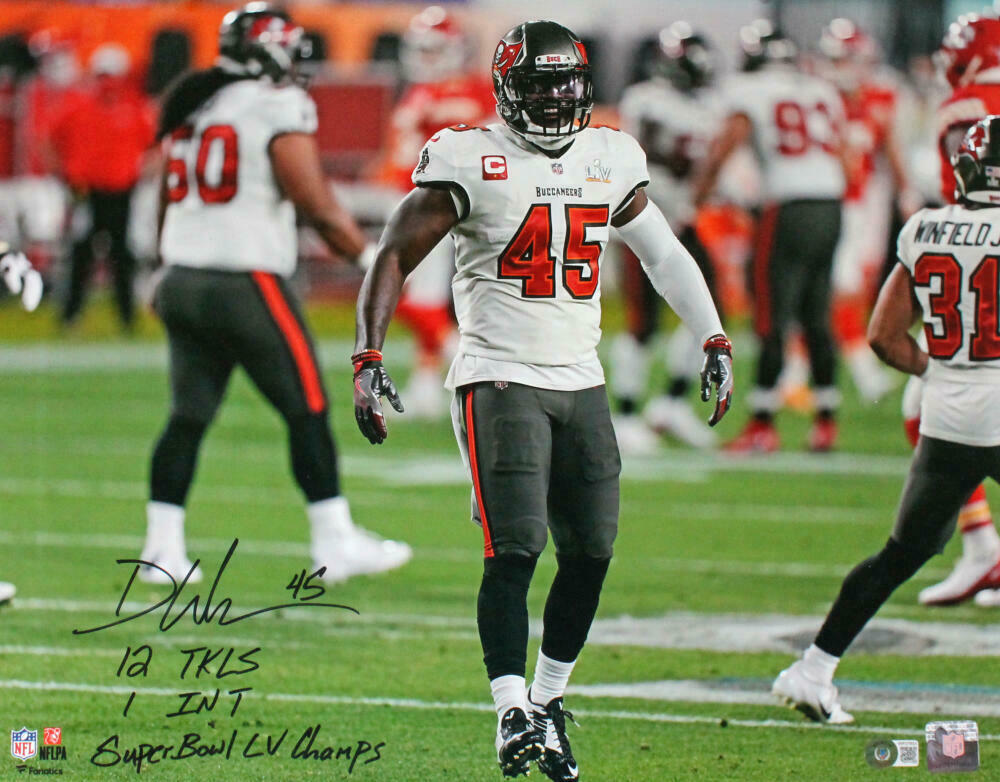 Devin White Autographed Buccaneers 16x20 Smile w/3 Insc.-Beckett W Hologram *Black This is a Hand Autographed 16x20 photo of Devin White of the Tampa Bay Buccaneers inscribed with SB Champs, 12 TKLS, 1 INT. This item has a Beckett Witness Authentication, which comes with a Beckett numbered hologram and a generic Certificate of Authenticity. You can view this item on the Beckett Authentication website, it shows when and where the item was signed. It was signed either at a public autograph appearance or a private signing. This is a stock photo of the item. Although you may not receive this exact item, the item you receive is virtually identical and brand new in great shape.