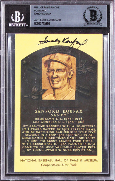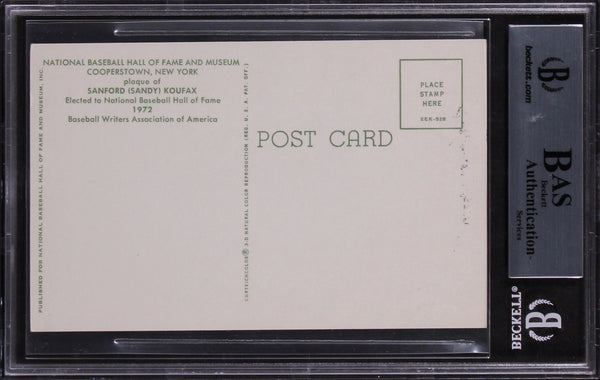 This Autographed Hall of Fame Plaque Postcard has been Personally Signed by Sandy Koufax of the Los Angeles Dodgers. This item is 100% Authentic, it comes slabbed and authenticated by Beckett Authentication Services. The authenticity can be verified on Beckett Authentication Services website.