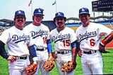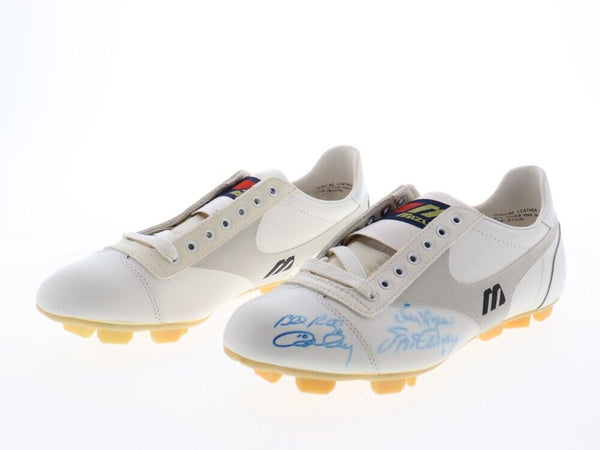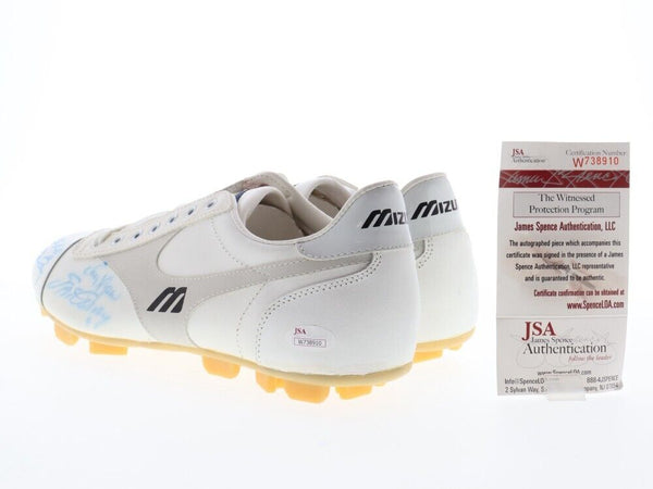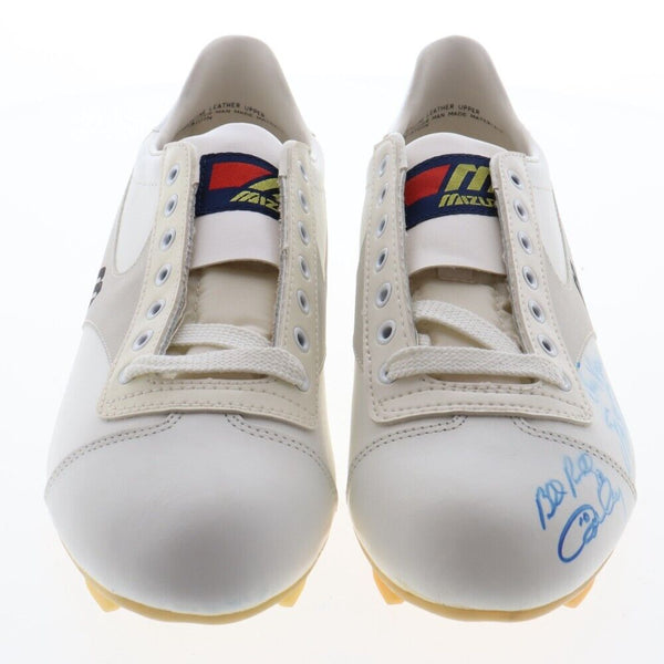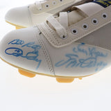 Pair of Mizuno baseball cleats. The left cleat has been hand-signed by Ron Cey, Steve Garvey, Bill Rusell and Davey Lopes. Please note, some signatures are slightly faded (see photos).From 1973 to 1981, the Los Angeles Dodgers played a majority of their games with a starting infield consisting of four players: Steve Garvey at 1st Base, Davey Lopes 2nd Base, Ron Cey at 3rd Base, and Bill Russell at shortstop. Beginning on June 23, 1973, and lasting until Game 6 of the 1981 World Series, the quartet set an MLB record for the length of time the same four players were designated as starters at those positions--eight-and-a-half years.The autograph(s) includes an official James Spence Authentication (JSA) hologram and matching COA for authenticity purposes. The signing of this item was witnessed by JSA.Authentication: JSA COA