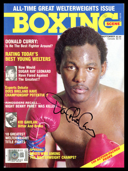 This is a Boxing Scene magazine that has been hand signed by Donald Curry. This item has been certified authentic by Beckett Authentication (BAS) and comes with their Tamper-proof QR Code Hologram that can be verified on the Beckett-authentication.com.