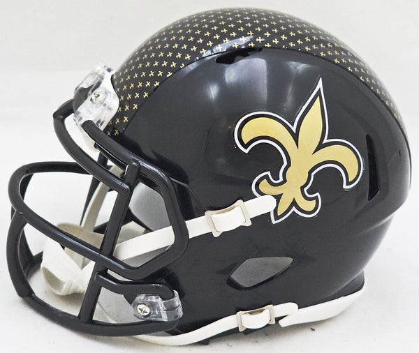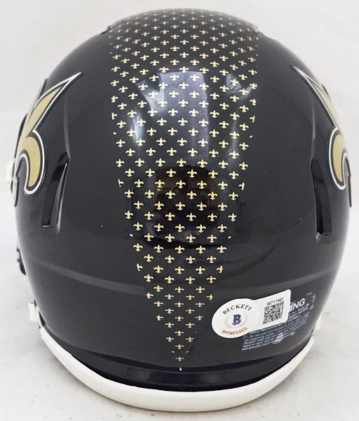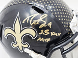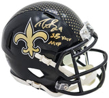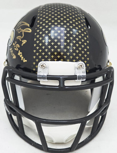 This is a New Orleans Saints 2022 Alternate Black Speed Mini Helmet that has been hand signed by Drew Brees. This item was inscribed "SB XLIV MVP." This item has been witnessed and certified authentic by Beckett Authentication (BAS) and comes with their tamper-proof witness sticker.