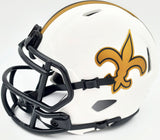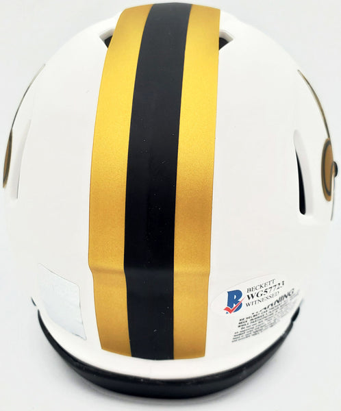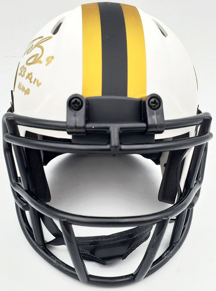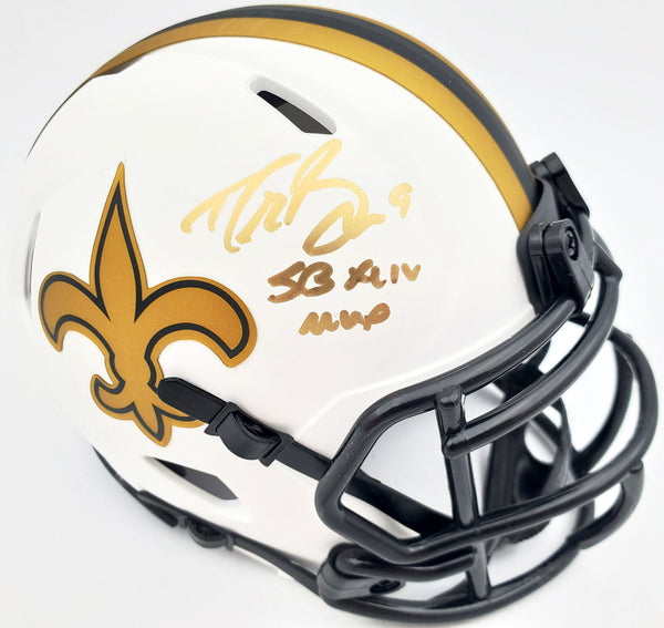 This is a New Orleans Saints Lunar Eclipse White Speed Mini Helmet that has been hand signed by Drew Brees. This item was inscribed "SB XLIV MVP." This item has been certified authentic by Beckett Authentication (BAS) and comes with their tamper-proof sticker and matching certificate of authenticity.