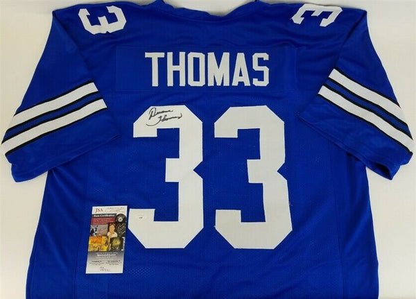 Custom on-field style jersey. Everything is sewn on, size XL. Hand-signed in black felt-tip pen by Duane Thomas. The autograph includes an official James Spence Authentication (JSA) hologram and matching COA for authenticity purposes.Authentication: JSA COA