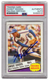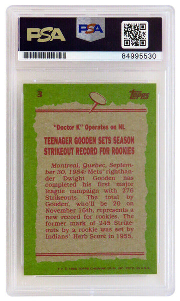 Dwight Gooden signed New York Mets 1985 Topps Record Breaker baseball trading card #3. The card has been authenticated and encapsulated by PSA/DNA and the number can be verified online. The image of the item is a stock photo, as we may have multiples of the item in stock. The Slabbed Card you will receive will be of the card described. (Same grade, Same authentication) You may or may not receive the exact PSA serial number on the slab label shown in image.