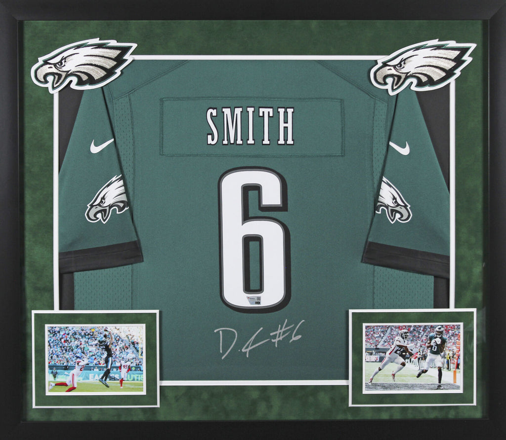 This Autographed Green Nike Game Framed Jersey has been Personally Signed by DeVonta Smith of the Philadelphia Eagles. This item is 100% Authentic to includes a numbered hologram by Fanatics. We conducted an autograph signing with DeVonta Smith where multiples of the same item were signed. While the photographs are representative of this item, the size, placement and strength of the signature may vary. Each item is hand signed, therefore, each autograph is unique. This item can be verified through Fanatics. This item has been professionally framed to overall dimensions of approximately 32 x 37 inches. These jerseys are framed to order, it takes approximately 3-4 business days for framing to be completed.
