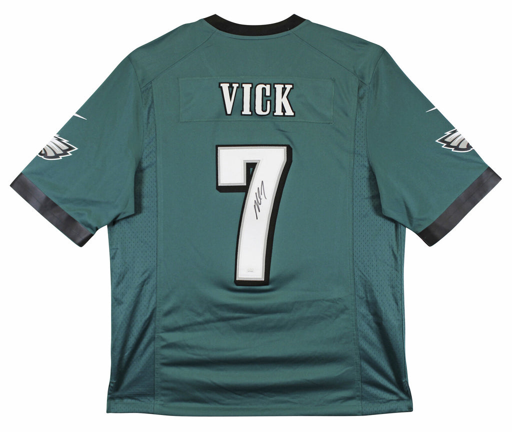 This Autographed w/ Sewn Numbers Green Nike Limited Jersey has been Personally Signed by Michael Vick of the Philadelphia Eagles. This item is 100% Authentic to include a Certificate of Authenticity (COA) / hologram by JSA Witness. This is a JSA Witnessed Protection Program item which means a JSA representative was present when this item was being signed. We conducted an autograph signing with Michael Vick where multiples of the same item were signed. While the photographs are representative of this item, the size, placement and strength of the signature may vary. Each item is hand signed, therefore, each autograph is unique. This item can be verified through JSA Witness. Multiple sizes available. Reach out for availability.