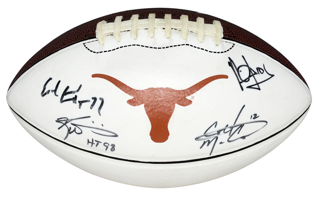 This Texas Longhorns white panel Nike football has been hand signed by 4 Texas legends; Earl Campbell, Ricky Williams, Vince Young and Colt McCoy. This item comes with a certificate of authenticity (COA) from Beckett Authentication Services and was signed in the presence of one of their representatives. You will receive a serial-numbered COA along with a matching serial-numbered sticker on the ball. The authenticity can be verified online by entering the serial number.Item pictured may not be the exact item you will receive. It will be similar quality, and we guarantee your satisfaction.