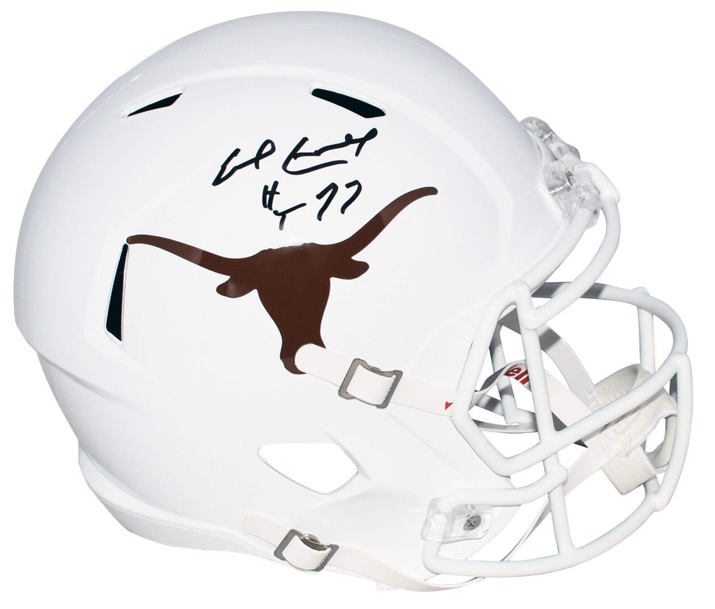 Earl Campbell, former Heisman Trophy winning running back for the Longhorns, has hand signed this Texas Riddell Speed full-size replica helmet at a private signing. He included the inscription "HT 77" with his signature. This item is authenticated by Beckett Authentication Services and was signed in the presence of one of their representatives. Their tamper-evident hologram featuring a QR code and serial number is on the item. The authenticity can be verified online by entering the serial number or scanning the QR code.Item pictured may not be the exact item you will receive. It will be similar quality, and we guarantee your satisfaction.
