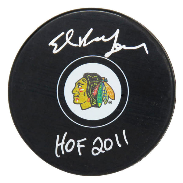Ed Belfour signed Chicago Blackhawks logo hockey puck with 'HOF 2011' inscription. Item comes with a Schwartz Sports Memorabilia tamper-proof numbered hologram and Certificate of Authenticity which can be verified online.