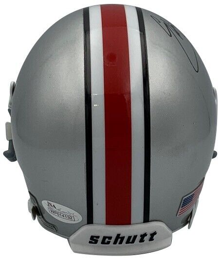 Eddie George has autographed this official Ohio State mini helmet and written HEISMAN 1995. Autograph is authenticated and witnessed by James Spence Authentication (JSA) the world's leading authenticator of sports autographs. Item comes with their unique hologram # on the item that is verified on their website. 100% authentic. Auto does have a slight smudge to it.