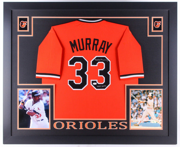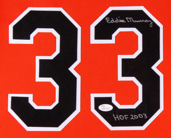 Custom frame measures approximately 35 "x 43 " in size and features a jersey which has been hand-signed and inscribed in silver paint pen by Eddie Murray. The lot / autograph(s) includes an official James Spence Authentication (JSA) hologram and matching COA for authenticity purposes. The signing of this item was witnessed by JSA.Authentication: JSA COA