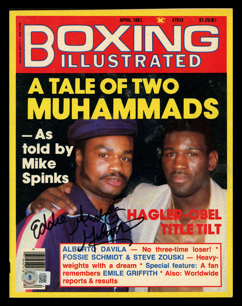 This is a Boxing Illustrated Magazine that has been hand signed by Eddie Mustafa Muhammad. This item has been certified authentic by Beckett Authentication (BAS) and comes with their tamper-proof QR Code hologram that can be verified on the Beckett-authentication.com.