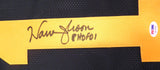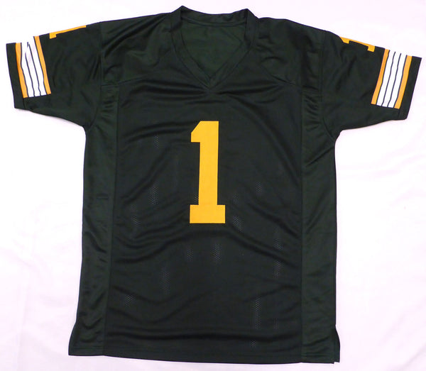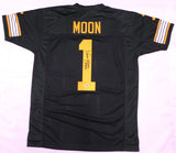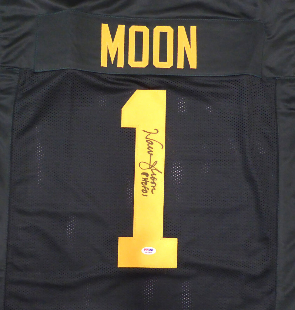This is a Green Jersey that has been hand signed by Warren Moon. This is a custom jersey with no name brand. The approximate size is XL. It has nice sewn in name and numbers. This item was inscribed "CHOF 01." This item has been certified authentic by PSA/DNA and comes with their tamper-proof sticker and matching certificate of authenticity.A NOTE: The "C" in "CHOF" is a little smudged, as shown in the pictures.