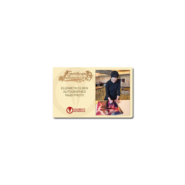 This 16x20 photo of the powerful Avenger, Scarlet Witch has been personally hand-signed by Elizabeth Olsen during her signing with Celebrity Authentics. Wanda is initially depicted as a Sokovia refugee who, along with her twin brother Pietro, volunteers to be experimented on by Hydra. The Mind Stone amplifies her natural telekinetic and energy manipulation abilities known as Chaos magic. Wanda initially comes into conflict with the Avengers but later joins them and becomes one of its most powerful members. Ships affixed with Celebrity Authentics serial-numbered and tamper evident Authentication Hologram and includes Celebrity Authentics Certificate of Authenticity featuring picture of Elizabeth signing photo.Please note: with multiples signed by the actor, a sample photo is used from stock to represent what you will receive. Exact autograph size and placement may vary.