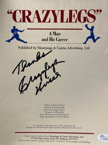 Elroy Hirsch Autographed Los Angeles Rams 1987 Crazy Legs Program JSA 38255 The number in the listing title is just an inventory sku for our records and is not the authentication number. This is the exact item that you will receive so please see pictures for condition. This is a 1987 Crazy Legs program that was personally autographed by Elroy Hirsch. He signed the first page inside the cover. Includes a certificate of authenticity from James Spence Authentication (JSA) and Denver Autographs.