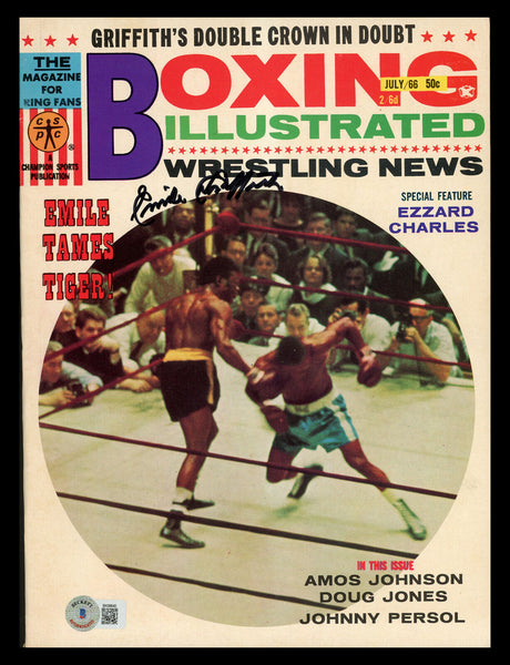 This is a Boxing Illustrated Magazine that has been hand signed by Emile Griffith . This item has been certified authentic by Beckett Authentication (BAS) and comes with their tamper-proof QR Code hologram that can be verified on the Beckett-authentication.com.