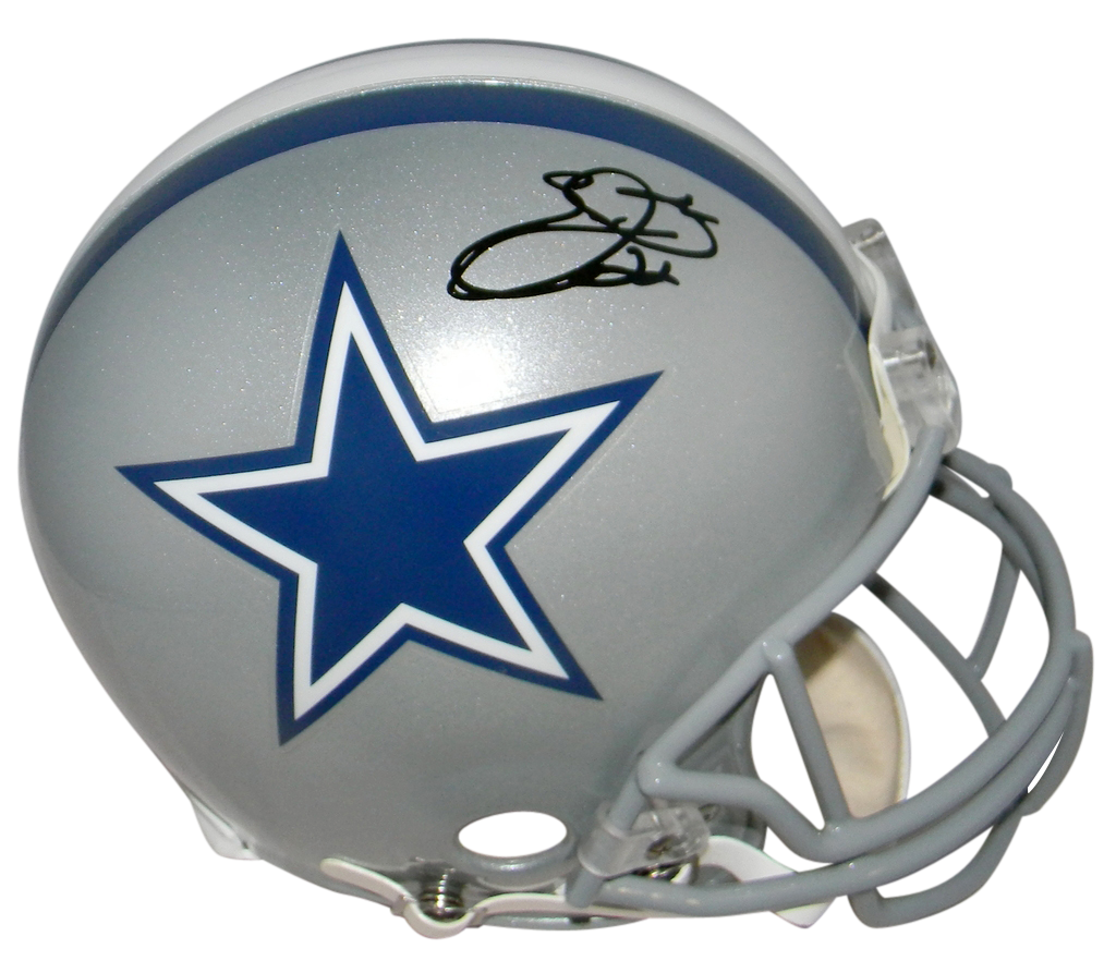 Emmitt Smith, former Hall of Fame running back for the Dallas Cowboys, has hand signed this Cowboys Riddell full-size authentic helmet at a private signing. This helmet is fully padded inside like the ones worn on the field. This item comes with a certificate of authenticity (COA) from JSA - James Spence Authentication and was signed in the presence of one of their representatives. You will receive a serial-numbered COA along with a matching serial-numbered sticker on the helmet. The authenticity can be verified online by entering the serial number. A Prova Group serial-numbered smart chip is also on the helmet.Item pictured may not be the exact item you will receive. It will be similar quality, and we guarantee your satisfaction.