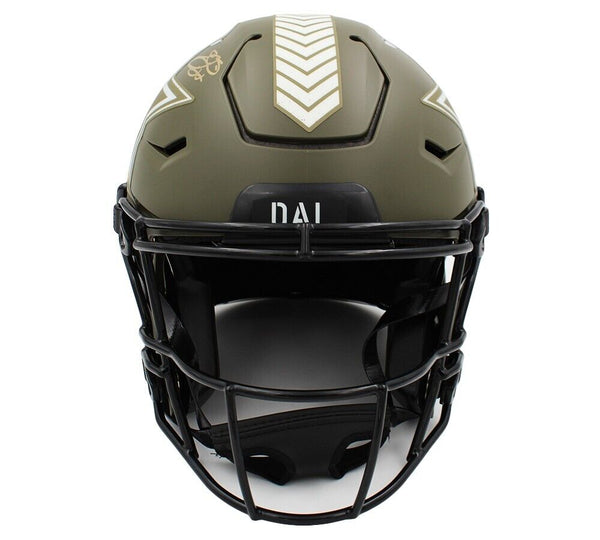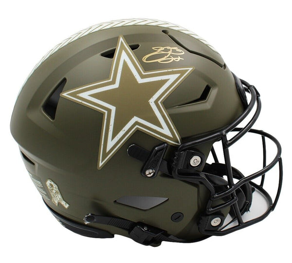 A Dallas Cowboys Speed Flex Authentic Salute to Service NFL Helmet hand signed by Emmitt Smith. The item and signature are in excellent condition. Emmitt is a former NFL running back. He was inducted into the Pro Football Hall of Fame in 2010, 3x Super Bowl Champion, Super Bowl MVP (XXVIII), 8x Pro Bowler, 4x First-Team All Pro. AUTHENTICATION: Your item is tagged with a SmarTag powered by Prova Technology, which gives you digital access to your items authentication records, which includes a proof picture from the signing.