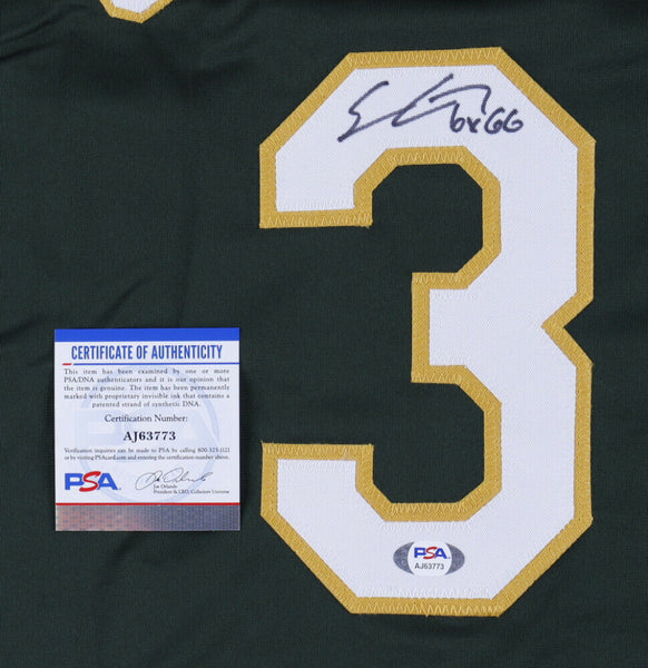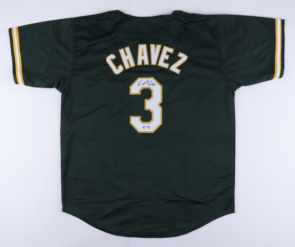 Custom on-field style jersey. Everything sewn on, size XL. Hand-signed in black Sharpie pen by Eric Chavez. The lot / autograph(s) includes an official PSA/DNA hologram and matching COA for authenticity purposes. Authentication: PSA COA