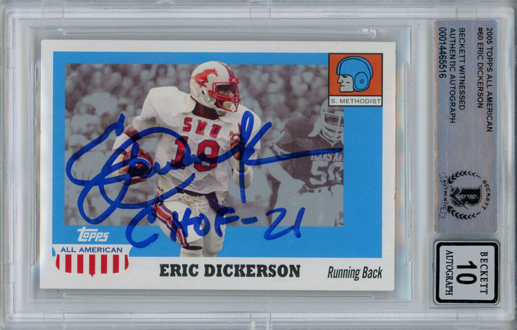 Eric Dickerson Signed 2005 Topps All American Trading Card CHOF BAS 10 Slab 38601 The number in the listing title is just an inventory sku for our records and is not the authentication number. The item pictured is a stock photo unless otherwise noted. This is a trading card that was personally autographed by Eric Dickerson with CHOF inscription. This has been professionally slabbed by Beckett Authentication Services (BAS) and includes a certificate of authenticity from Denver Autographs.