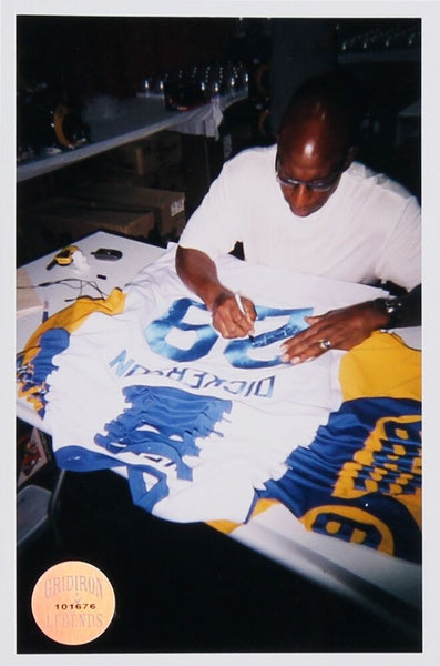 Custom on-field style jersey. Everything is sewn on, size XL. Hand-signed and inscribed in black paint pen by Eric Dickerson. (HOF) The lot / autograph(s) includes an official James Spence Authentication (JSA) hologram and matching COA for authenticity purposes. The signing of this item was witnessed by JSA.Authentication: JSA COA Check out over 8,000 other autographed items at our E Bay Store : Friendly Confines Collectibles.