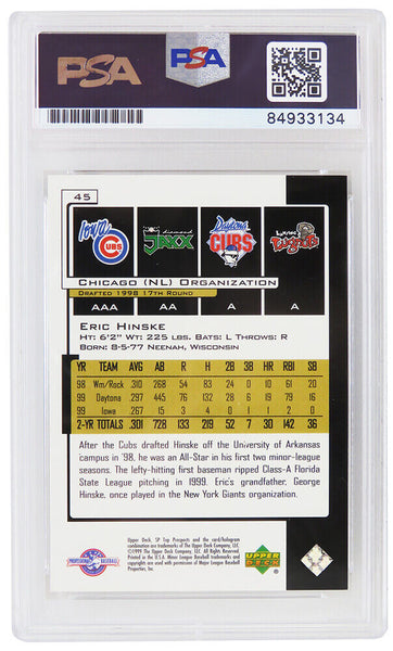 Eric Hinske Signed 2000 SP Topps Prospect rookie baseball trading card #45. The card has been authenticated and encapsulated by PSA/DNA and the number can be verified online.The image of the item is a stock photo, as we may have multiples of the item in stock. The Slabbed Card you will receive will be of the card described. (Same grade, Same authentication) You may or may not receive the exact PSA serial number on the slab label shown in image.