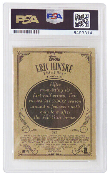 Eric Hinske Signed Blue Jays 2002 Topps rookie baseball card #383. The card has been authenticated and encapsulated by PSA/DNA and the number can be verified online. The image of the item is a stock photo, as we may have multiples of the item in stock. The Slabbed Card you will receive will be of the card described. (Same grade, Same authentication) You may or may not receive the exact PSA serial number on the slab label shown in image.