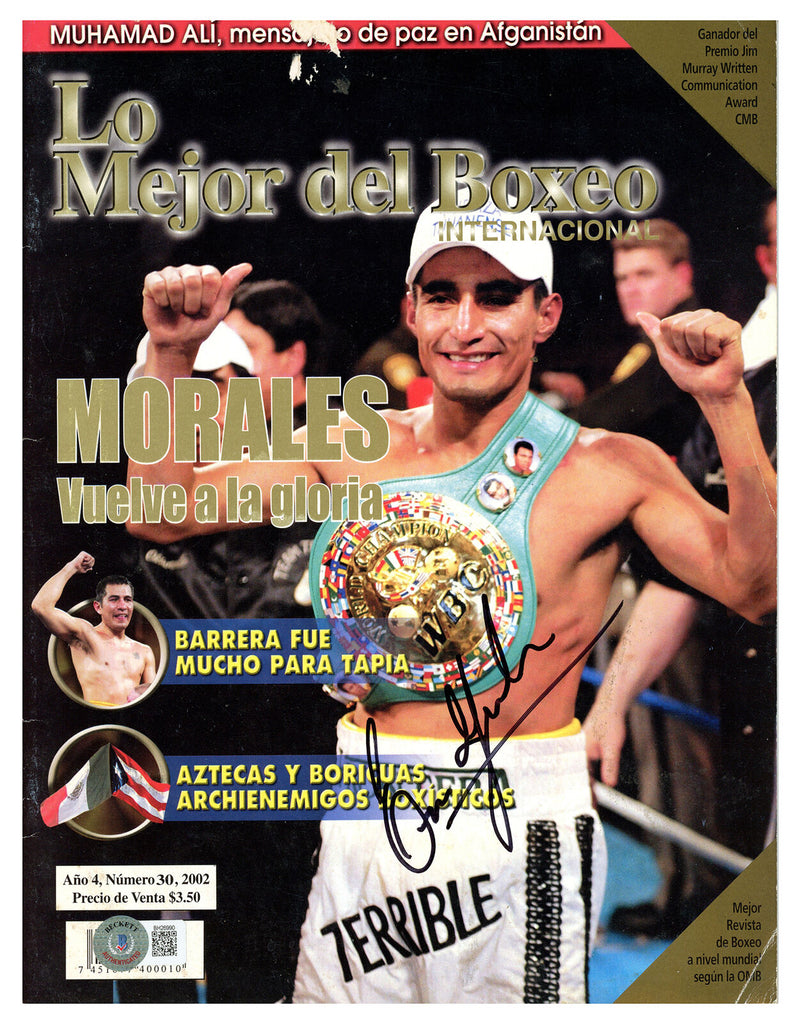 This is a magazine that has been hand signed by Erik Morales. There is damage towards the top of the magazine. This item has been certified authentic by Beckett Authentication (BAS) and comes with their Tamper-proof QR Code Hologram that can be verified on the Beckett-authentication.com.