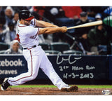 An Atlanta Braves Unframed 8x10 MLB Photo - Swinging hand signed by Evan Gattis. The item and signature are in excellent condition. In addition to signing his name, Evan also inscribed "1st Home Run 4-3-2013" on the item. AUTHENTICATION: The item is accompanied by a Certificate of Authenticity - Serial Numbered Hologram - Picture of Evan from the signing