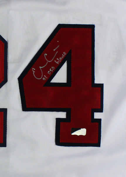 An Atlanta Custom White Jersey hand signed by Evan Gattis. The item and signature are in excellent condition. In addition to signing his name, Evan also inscribed "El Oso Blanco" on the item which means "The White Bear." He earned his name for crushing home-runs early in his minor league career. AUTHENTICATION: The item is accompanied with a Certificate of Authenticity - Serial Numbered and Databased Hologram - Picture of Evan from the signing