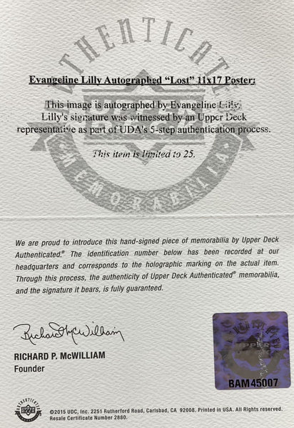 Featured is an Evangeline Lilly signed 11x17 Lost photo. This photo has been hand signed by Lilly and comes with the Upper Deck hologram and certificate of authenticity. This photo has been professionally framed and matted and is approximately 16x22. This photo would make a great addition to any sports memorabilia collection!. SPECIFICATIONS Autographed By: Team: Sport: Authentication: Upper Deck Authenticated (UDA)