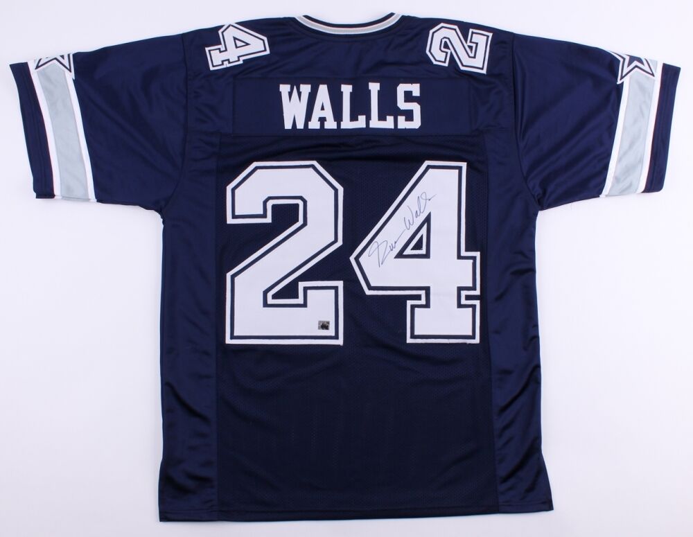 Custom on-field style jersey. Everything sewn on, size XL. Hand-signed in black felt tip pen by Everson Walls (Dallas Cowboys, New York Giants, Cleveland Browns). The autograph includes an official Everson Walls player hologram for authenticity purposes.Authentication: Walls Hologram
