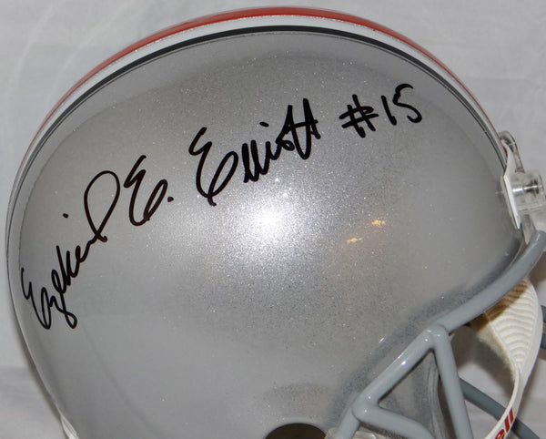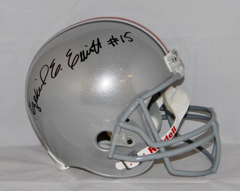 Ezekiel Elliott Autographed Ohio State Buckeyes F/S Riddell Helmet- JSA W Auth This is a Hand Autographed Helmet of Ezekiel Elliott of The Ohio State University. This is a Riddell Football Full Size Replica Helmet. This item has a James Spence Witness Protection Authentication, which Comes with a JSA #'ed Sticker and a Matching JSA COA. You can view this item on the SpenceLOA website and it shows when and where the item was signed. It was signed either at a public autograph appearance or a Private Signing. This is a stock photo of the item. Although you may not receive this exact item, the item you receive is virtually identical and brand new in great shape.