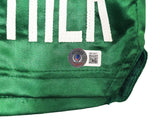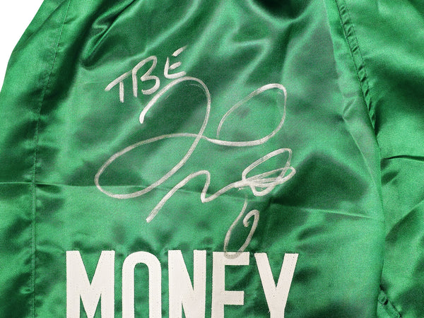 This is a pair of Green Boxing Trunks that has been hand signed by Floyd Mayweather Jr. This item was inscribed "TBE." This item has been witnessed and certified authentic by Beckett Authentication (BAS) and comes with their tamper-proof witness sticker.