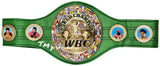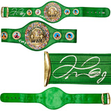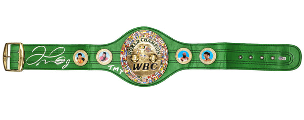 This is a Green WBC World Championship Boxing Belt that has been hand signed by Floyd Mayweather Jr. This item was inscribed "TMT." The belt is approximately 48 inches long by 10 inches tall. Please note, the signature is still a little bit wet and may smear if not handled properly. There may be small marks and creases on the belt. This item has been witnessed and certified authentic by Beckett Authentication (BAS) and comes with their tamper-proof witness sticker.