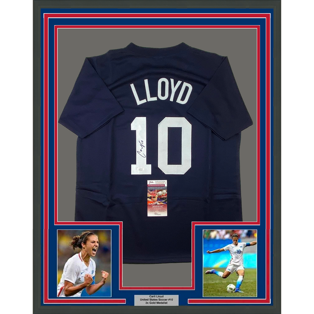 Framed Autographed Carli Lloyd 33x42 Navy Blue Team USA World Cup Jersey JSA COA The item is professionally framed & matted with two 8x10 photos, measures 33"x42" and is ready to be hung in your man cave! NOTE: COA card will be mounted on the back of the frame, not inside it on top of the jersey as seen in the picture.