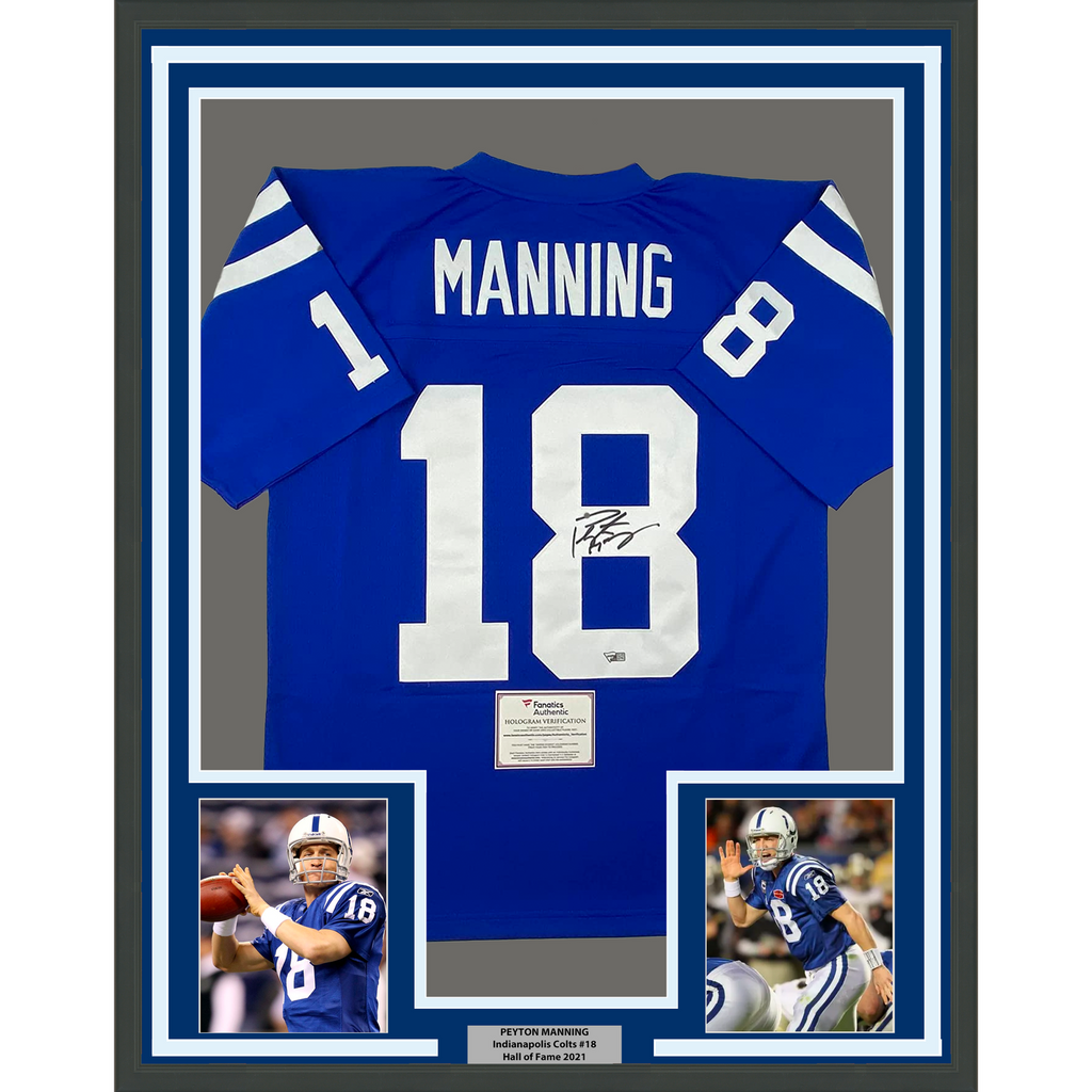 Framed Autographed Peyton Manning 33x42 Colts Authentic Jersey Fanatics COA The item is professionally framed & matted with two 8x10 photos, measures 33"x42" and is ready to be hung in your man cave! NOTE: COA card will be mounted on the back of the frame, not inside it on top of the jersey as seen in the picture.