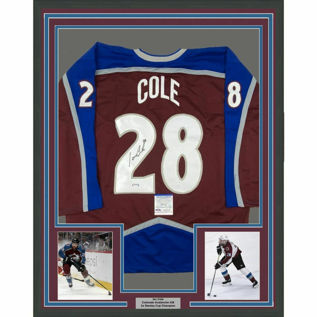FRAMED Autographed/Signed IAN COLE 33x42 Colorado Maroon Jersey PSA/DNA COA Auto The item is professionally framed & matted with two 8x10 photos, measures 33"x42" and is ready to be hung in your man cave! NOTE: COA card will be mounted on the back of the frame, not inside it on top of the jersey as seen in the picture.