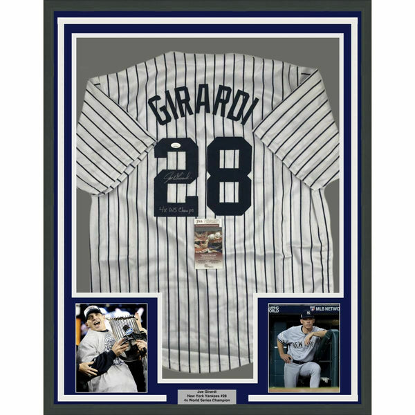FRAMED Autographed/Signed JOE GIRARDI 33x42 New York Pinstripe Jersey JSA COA The item is professionally framed & matted with two 8x10 photos, measures 33"x42" and is ready to be hung in your man cave! NOTE: COA card will be mounted on the back of the frame, not inside it on top of the jersey as seen in the picture. Please allow up to 5 business days for the item to be framed, packaged safely, and picked up by USPS. Photo and matting requests can be made.