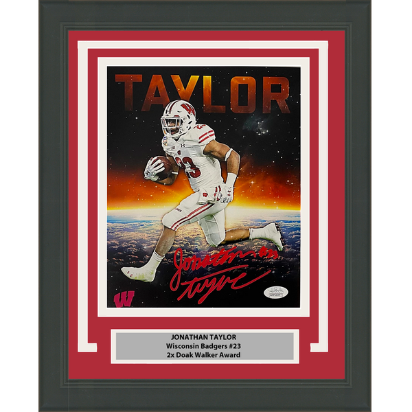 Framed Autographed/Signed Jonathan Taylor Wisconsin 8x10 Photo JSA COA #7 The item is professionally framed & matted and is ready to be hung in your man cave! NOTE: COA card, if applicable, will be mounted on the back of the frame.